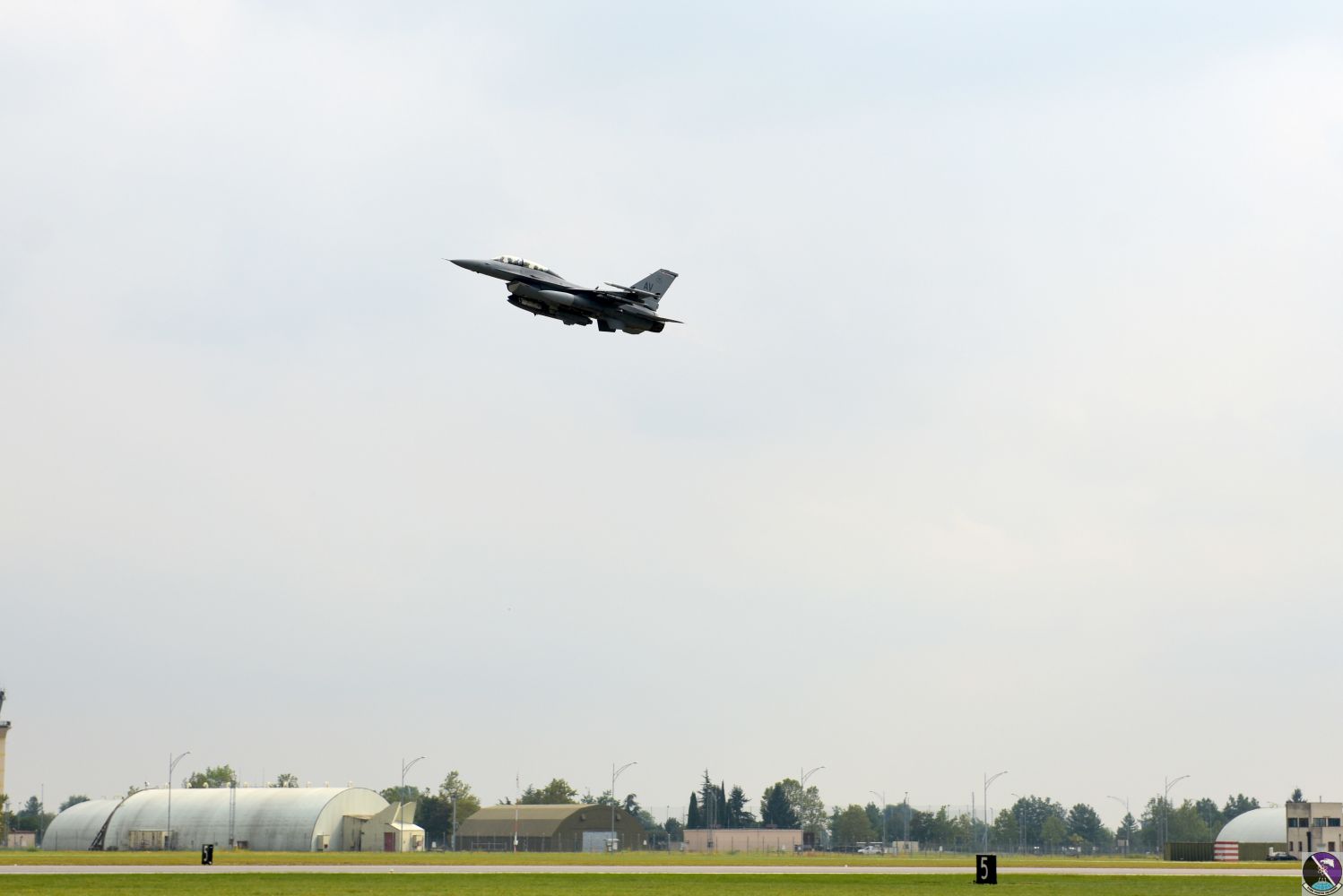 • Italian air force Col. Vincenzo Tozzi, Aviano base commander, and U.S. Air Force Lt. Col. Daniel Lindsey, commander of the 510th Fighter Squadron, take off in an F-16 Fighting Falcon at Aviano Air Base, Italy, Sept. 17, 2019. Col. Tozzi was given a flight in an F-16 as a show of gratitude from the 31st Fighter Wing for his time as base commander. (U.S. Air Force photo by Staff Sgt. Kelsey Tucker)
