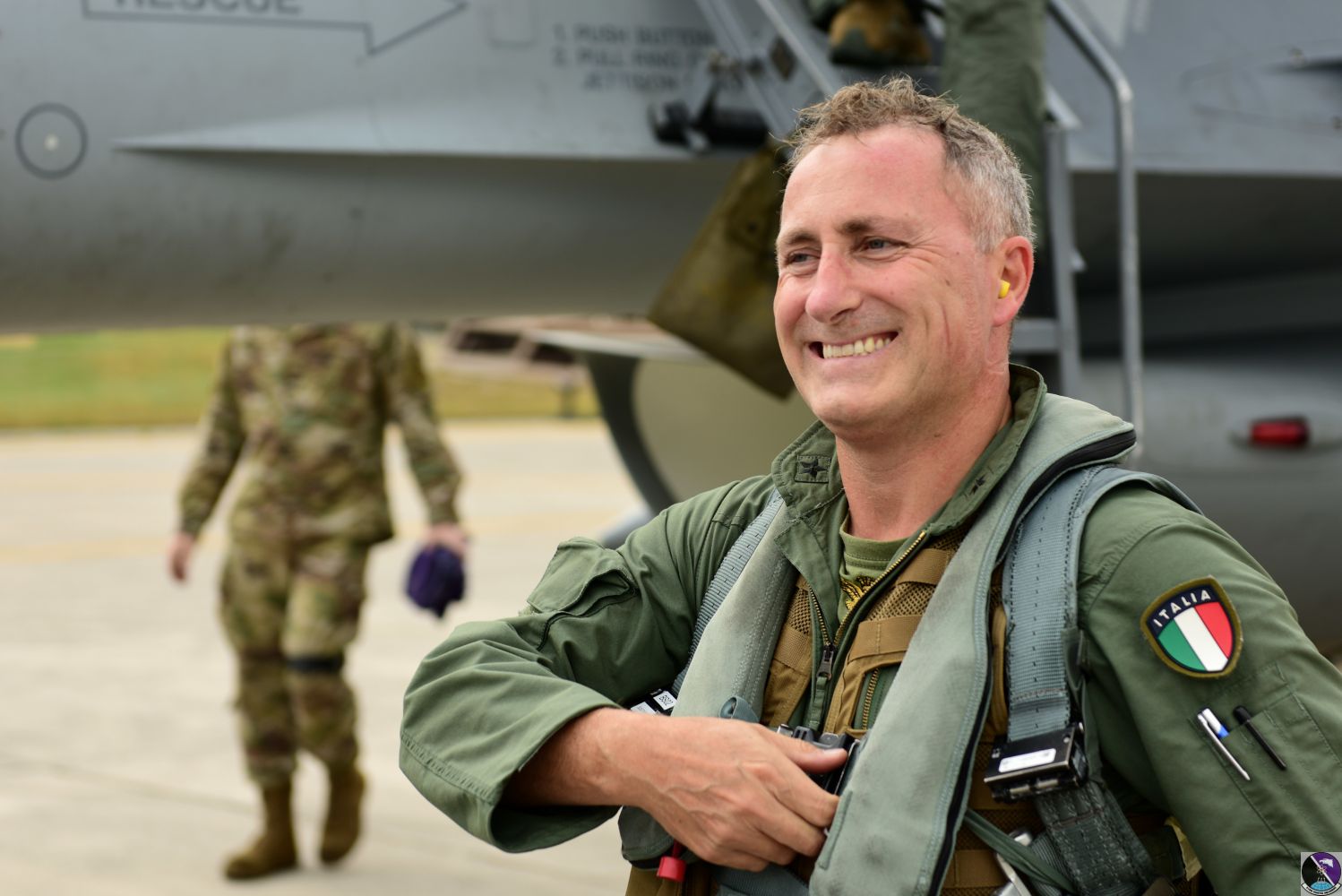 • Italian air force Col. Vincenzo Tozzi, Aviano base commander, greets friends and family after exiting an F-16 Fighting Falcon at Aviano Air Base, Italy, Sept. 17, 2019. Col. Tozzi was given a flight in an F-16 as a show of gratitude from the 31st Fighter Wing for his time as base commander. (U.S. Air Force photo by Staff Sgt. Kelsey Tucker)