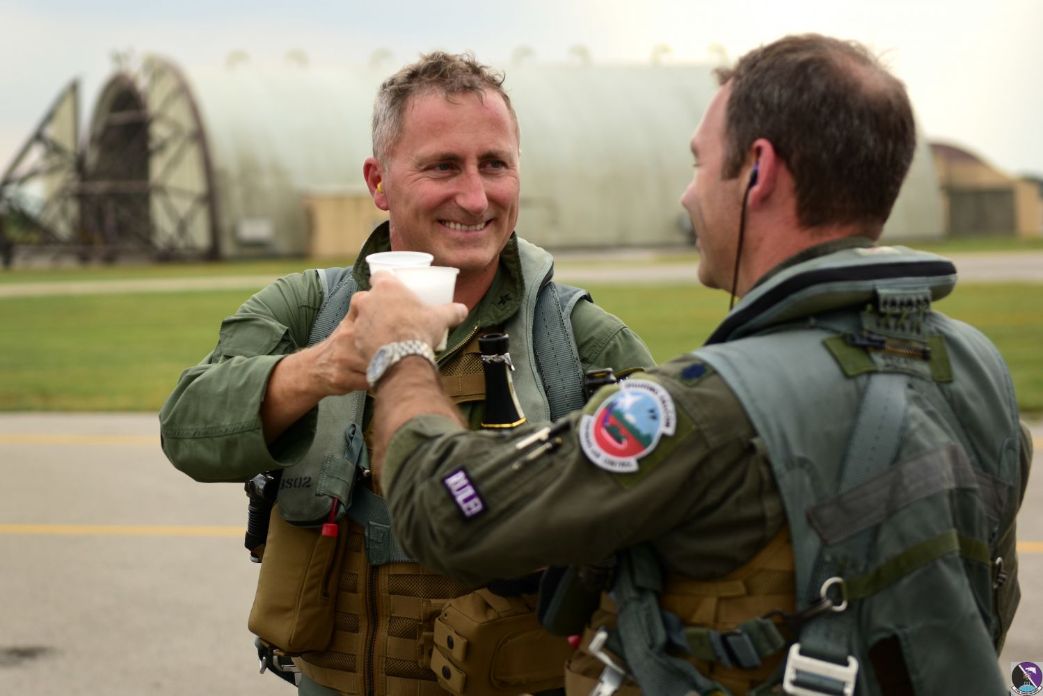 • Italian air force Col. Vincenzo Tozzi, Aviano base commander, left, and U.S. Air Force Lt. Col. Daniel Lindsey, commander of the 510th Fighter Squadron, share a toast at Aviano Air Base, Italy, Sept. 17, 2019. Col. Tozzi was Lt. Col. Lindsey’s instructor pilot while they were at Sheppard Air Force Base, Texas, 16 years ago. (U.S. Air Force photo by Staff Sgt. Kelsey Tucker)