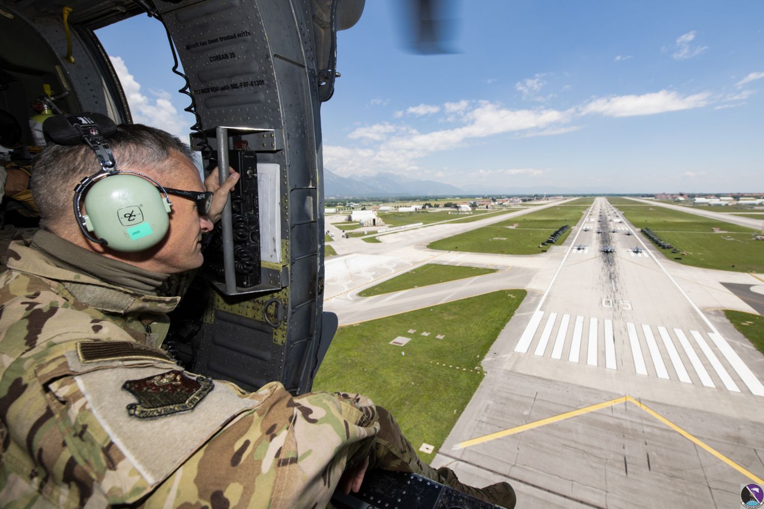 • U.S. Air Force Brig. Gen. Daniel T. Lasica, 31st Fighter Wing commander, overlooks an elephant walk while on an HH-60G Pave Hawk helicopter over Aviano Air Base, Italy, June 1, 2020. Elephant walks are a show of force, demonstrating the might and power of the U.S. Air Force and its bases. (U.S. Air Force photo by Airman Thomas S. Keisler IV)