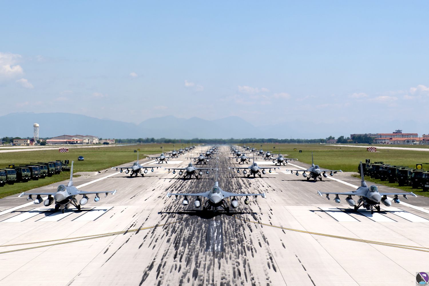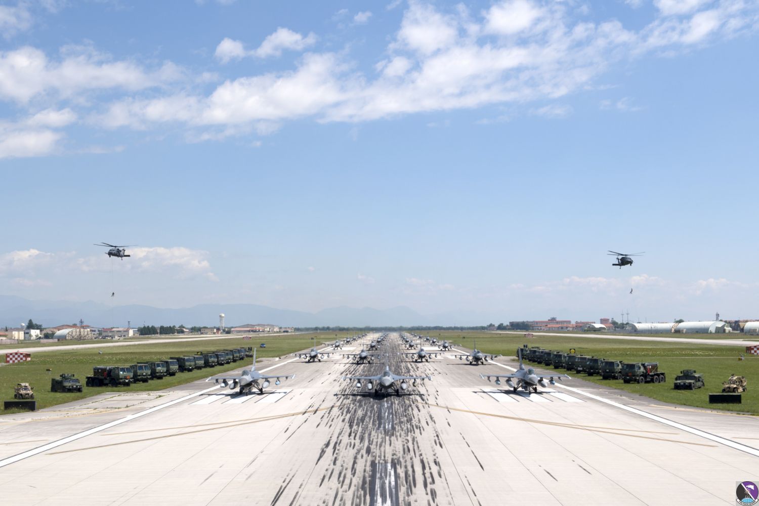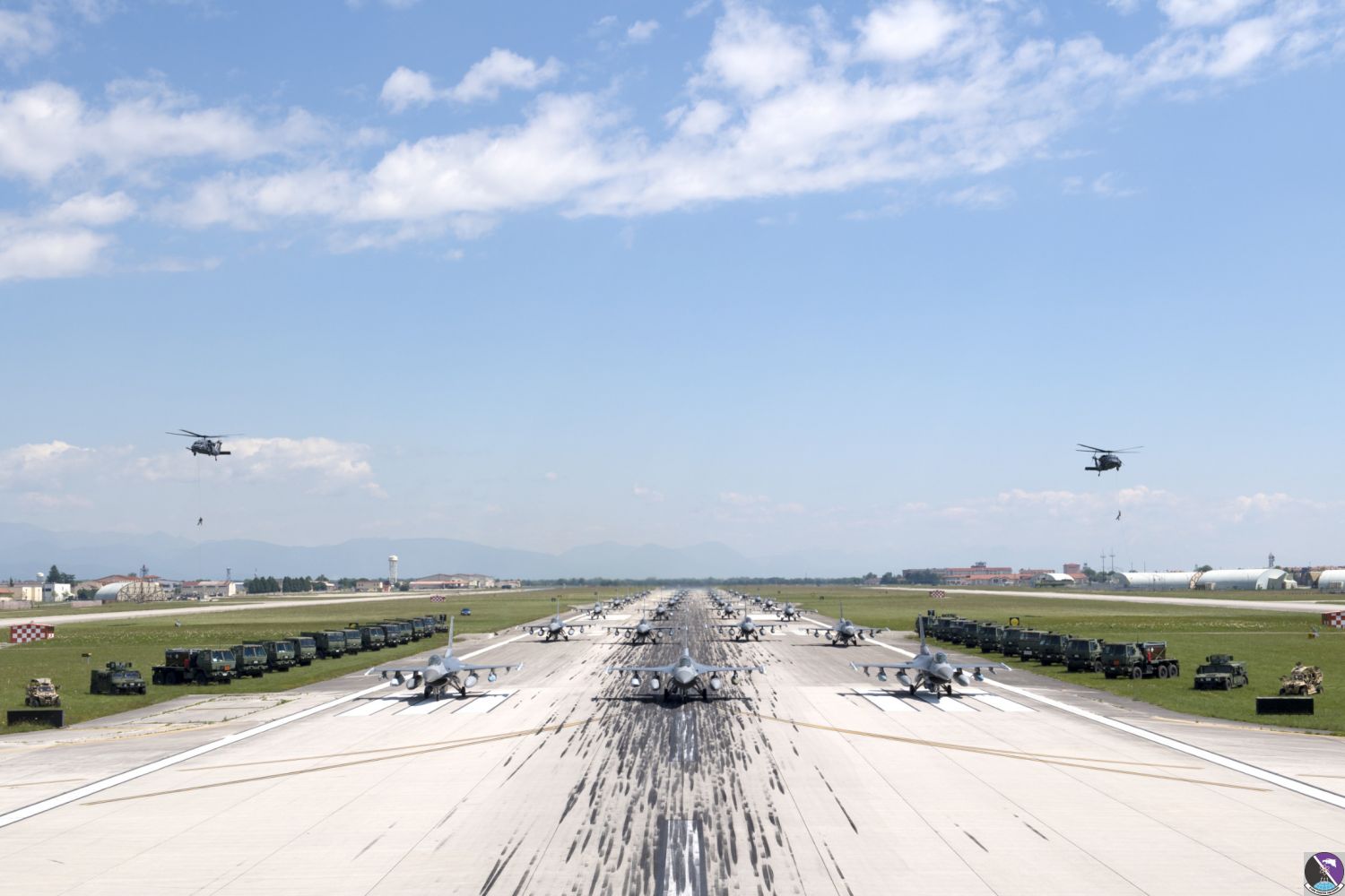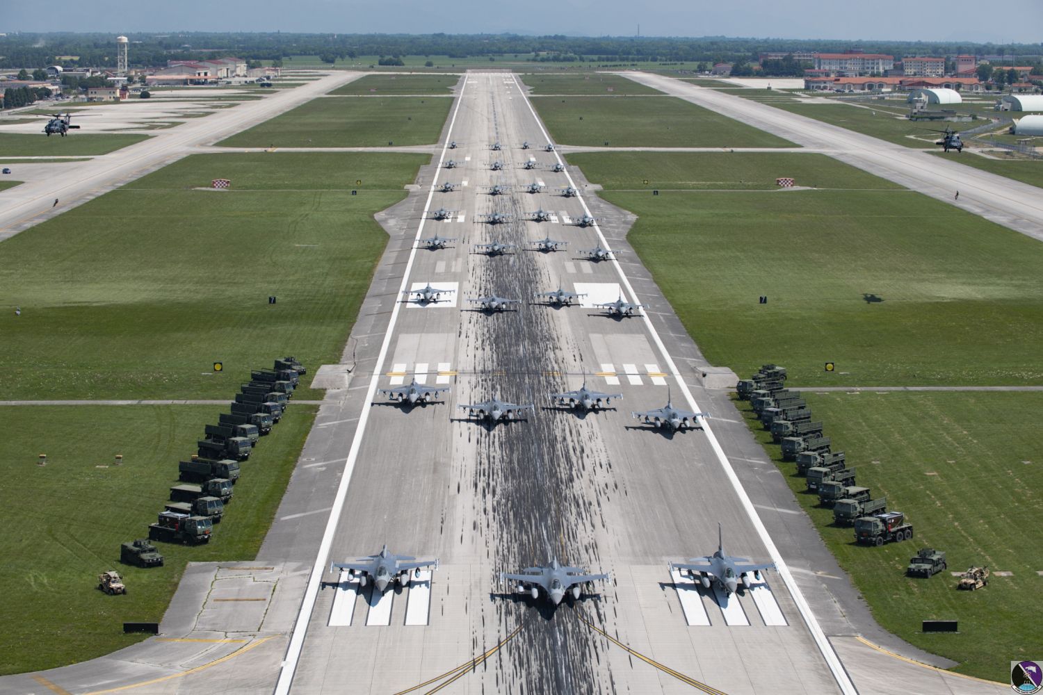• U.S. Air Force aircraft and vehicles assigned to the 31st Fighter Wing line the runway during an elephant walk at Aviano Air Base, Italy, June 1, 2020. Despite the restrictions in place due to COVID-19, the 31st FW remains lethal and combat ready, prepared to deter or defeat any adversary who threatens U.S. or NATO interests. (U.S. Air Force photo by Airman Thomas S. Keisler IV)
