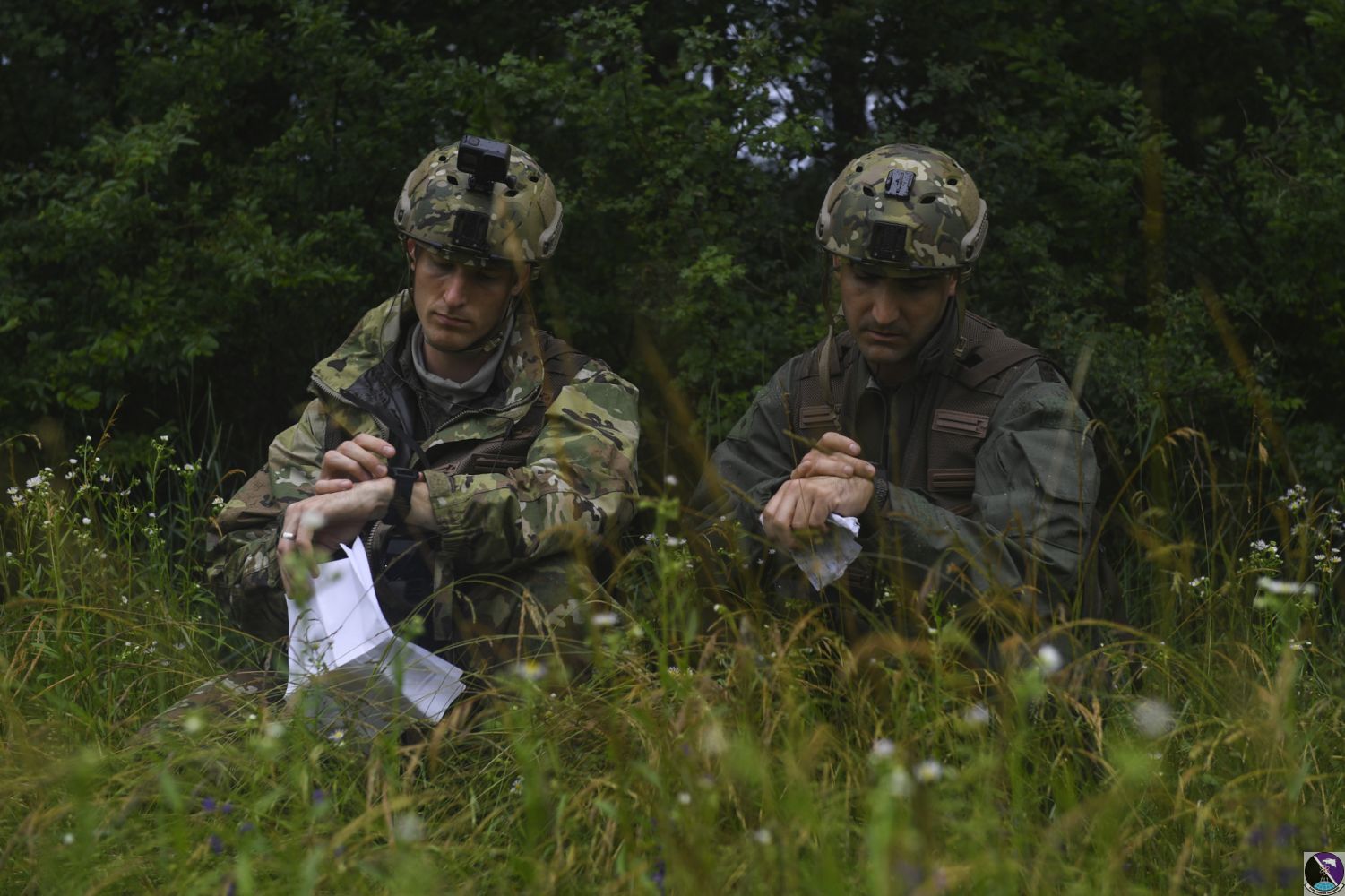 • U.S. Air Force Capt. James Gregory, 510th Fighter Squadron pilot and Maj. Matthew Robins, 555th Fighter Squadron pilot, use their radios during an exercise at Rivolto Air Base, Italy, June 10, 2020. The pilots were undergoing simulated Survival, Evasion, Resistance, Escape (SERE) training in which they had to survive and make contact with the proper sources after landing in enemy territory. (U.S. Air Force photo by Airman 1st Class Thomas S. Keisler IV)